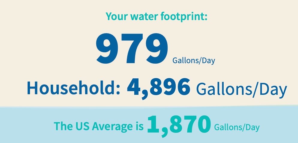After taking my water foot print test, I discovered that I fall bellow the US average which made me feel good. However, I noticed that I consume too much water during my showers, and that I should be more considerate whenever I shower. In addition, I was surprised to see that the national average for the toilet category was 14 gal/day.